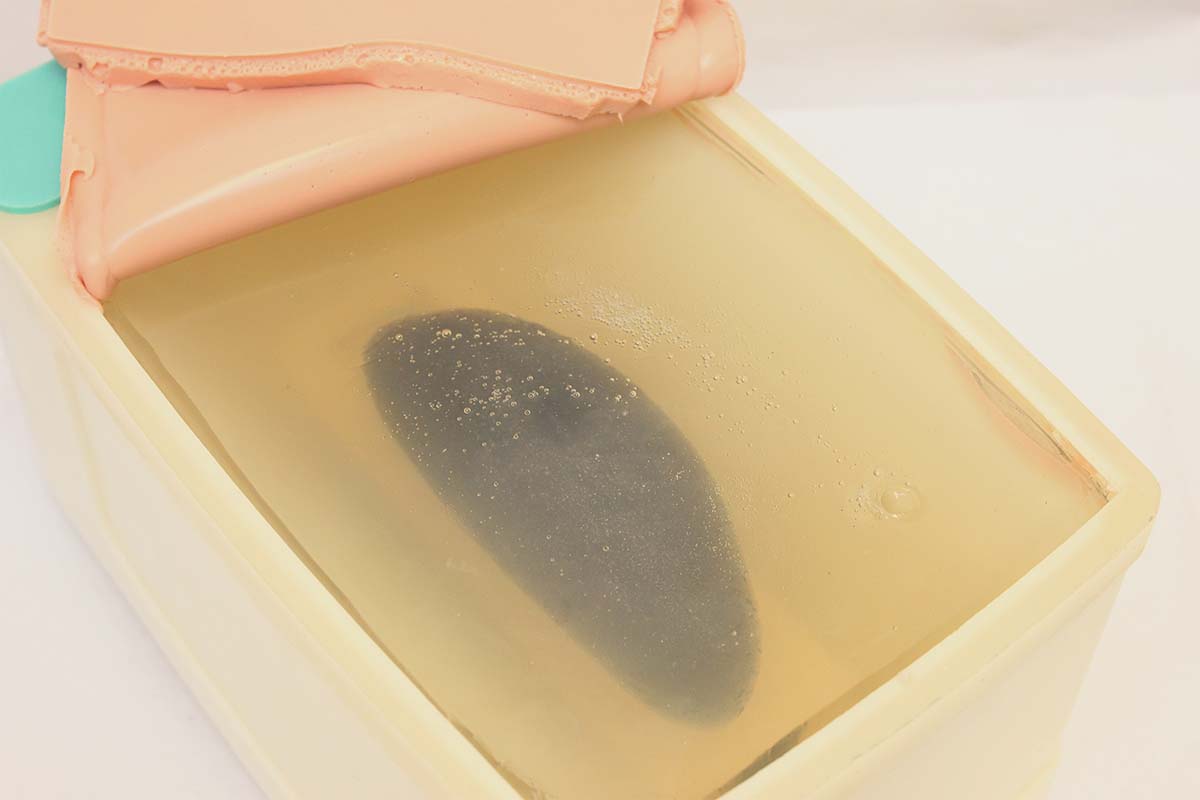 Our kidney phantom is encased in a rugged hardshell cover which makes it suitable for transportation and compact storaging. The kidney phantom’s inner gelatin contents have been prototyped with durability in mind and have been shown to sustain up to 200 fine needle punctures without significantly compromising ultrasonography signal quality and tactile feedback. The gelatin content is biodegradable and can be disposed cleanly after the kidney phantom has served its purpose.